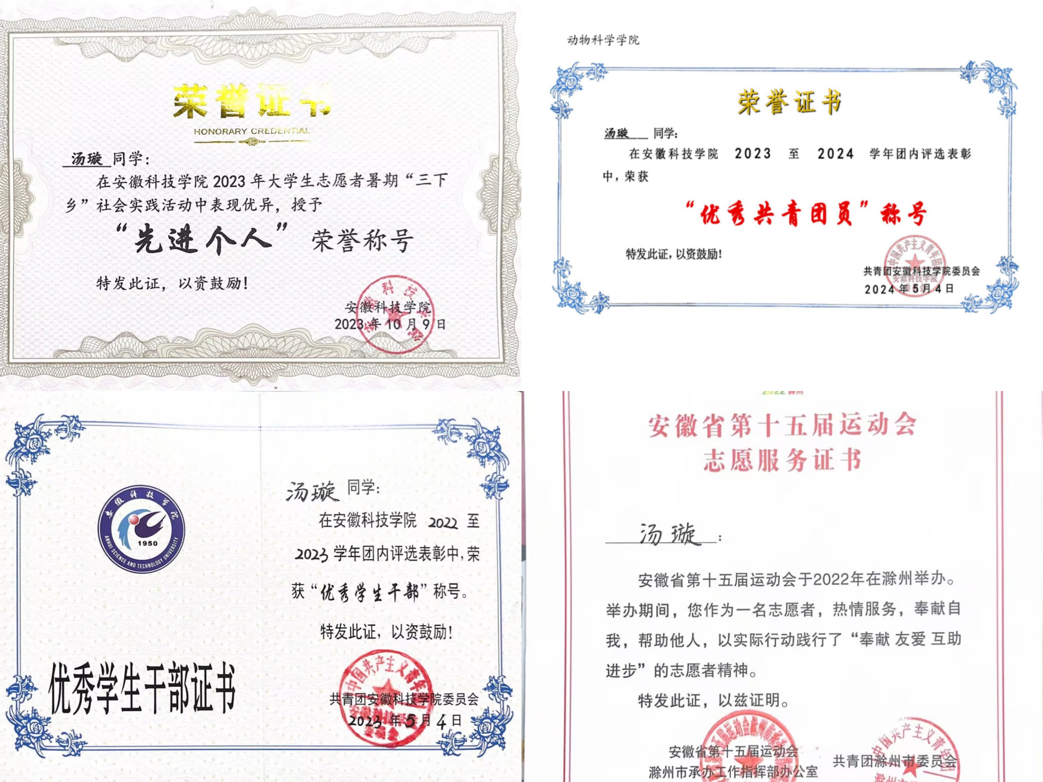 “比赛是检验学习成效的试金石”,她经常参加各项比赛,带着不怕失败、勇于试错的态度,大胆尝试,即便过程苦且累,但因热爱而充实。备赛“挑战杯”期间,汤璇一遍一遍地跟老师请教、练习,最终斩获第四届全国大学生动物科学专业技能大赛单项二等奖和团体二等奖。她参与的《萌宠驿站ing》和《资源利用饲料新模式》项目,在“挑战杯”创新创业大赛校内选拔赛中荣获银奖、铜奖,从专业实际出发,提高解决问题的能力,培养创新思维。