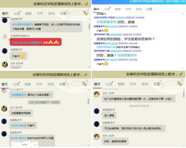 爱心关怀,教学相长。针对在线教学中学生遇到的各种问题,教师们及时跟踪,竭尽所能予以解决。对于自主学习能力较弱的学生,逐一交流,循循善导,激发学习兴趣。对于自主学习能力较强和要求较高的同学,线上“开小灶”,不厌其烦,逐一辅导,解疑释惑。学校对学生线上学习流量给予补助,每名学生按20元标准补助,对于家庭经济困难学生按40元标准补助,家庭经济特别困难学生按60元标准补助。生命与健康科学学院王晓鹏老师推进学习共同体,互相帮助,互相督促,共同考核。很多同学在讨论和反馈环节中比较各直播平台优劣,绘制了网络流畅度时间表。