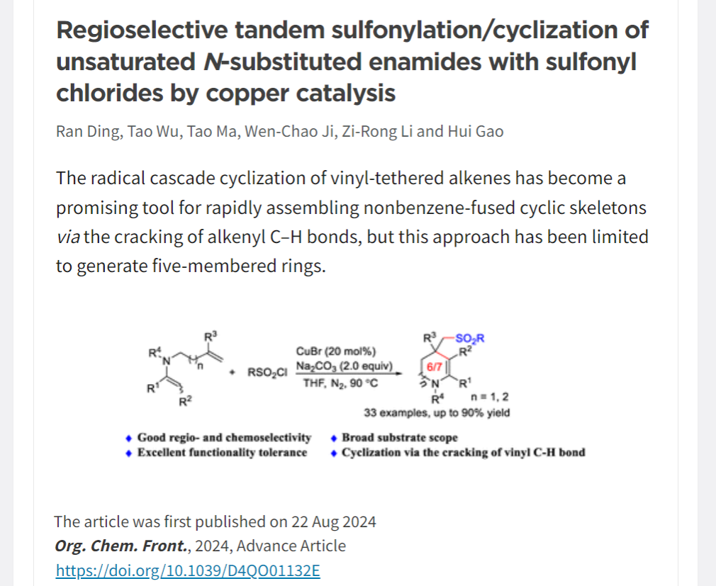 近日,化学与材料工程学院李子荣教授团队在烯胺杂环合上成取得重要进展,相关成果以“Regioselective tandem sulfonylation/cyclization of unsaturated N-substituted enamides with sulfonyl chlorides by copper catalysis”为题发表在中科院一区有机化学权威期刊《Organic Chemistry Frontiers》。