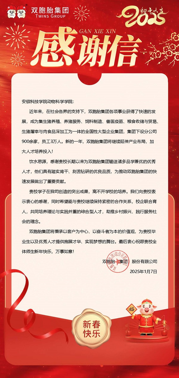 此次双胞胎(集团)股份有限公司发来感谢信,不仅是对动物科学学院人才培养质量的高度认可,也为双方未来进一步深化合作奠定了坚实基础。未来,双方将继续携手,共同为行业发展培养更多优秀人才。(特约通讯员:李焱 审核:周金星 编辑:李锦)