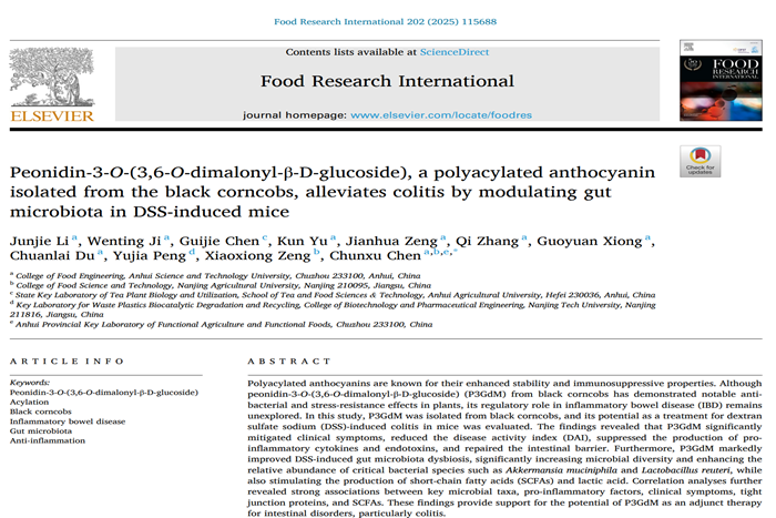 近日,食品科学与工程学院陈春旭副教授以通讯作者身份在国际Top期刊《Food Research International》(Q1,影响因子7.0)发表了题为“Peonidin-3-O-(3,6-O-dimalonyl-β-D-glucoside), a polyacylated anthocyanin isolated from the black corncobs, alleviates colitis by modulating gut microbiota in DSS-induced mice”的高水平研究论文,展现了新年新气象。该论文的第一作者为2022级食品加工与安全专业硕士研究生李俊杰,云鼎官方在线入口为论文第一完成单位,南京农业大学曾晓雄教授课题组为合作单位。