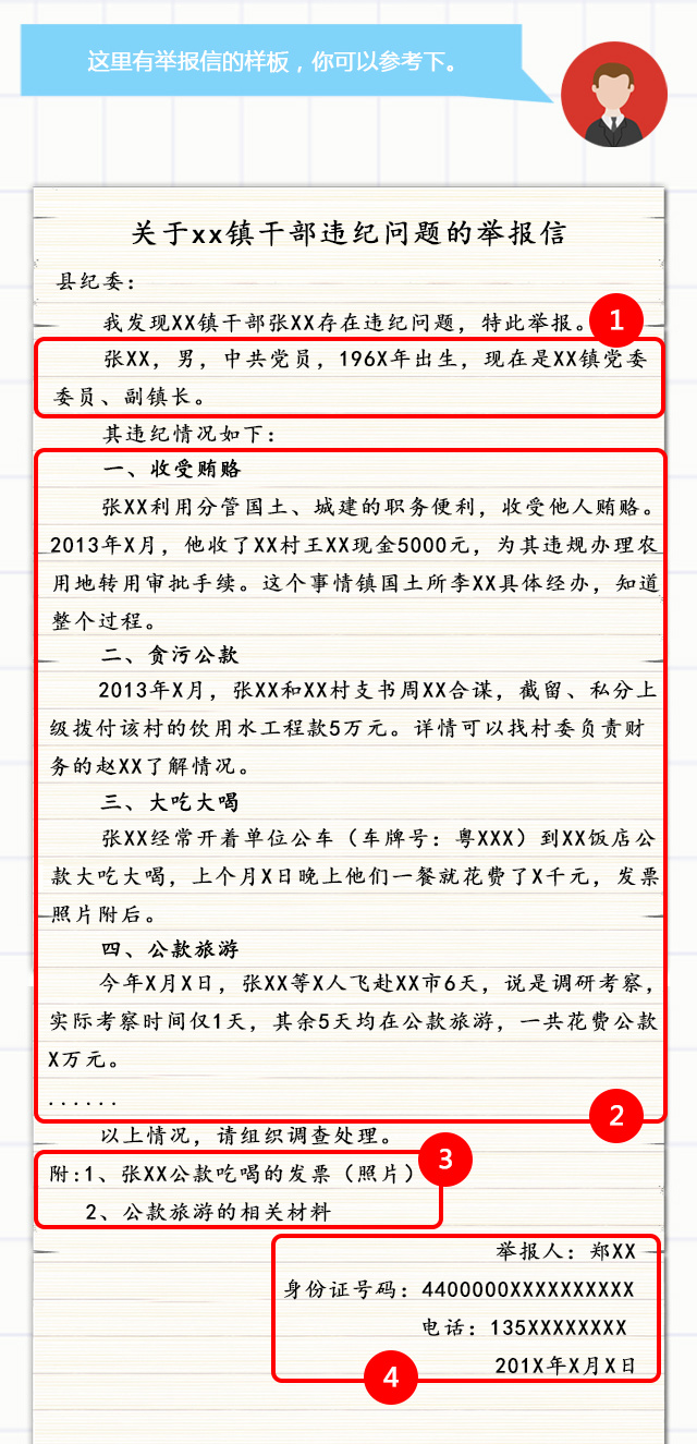 3.附件信息:举报信附有证据材料、照片或包含录音、视频等证据材料的光盘、U盘、存储卡的,应列明附件内容。