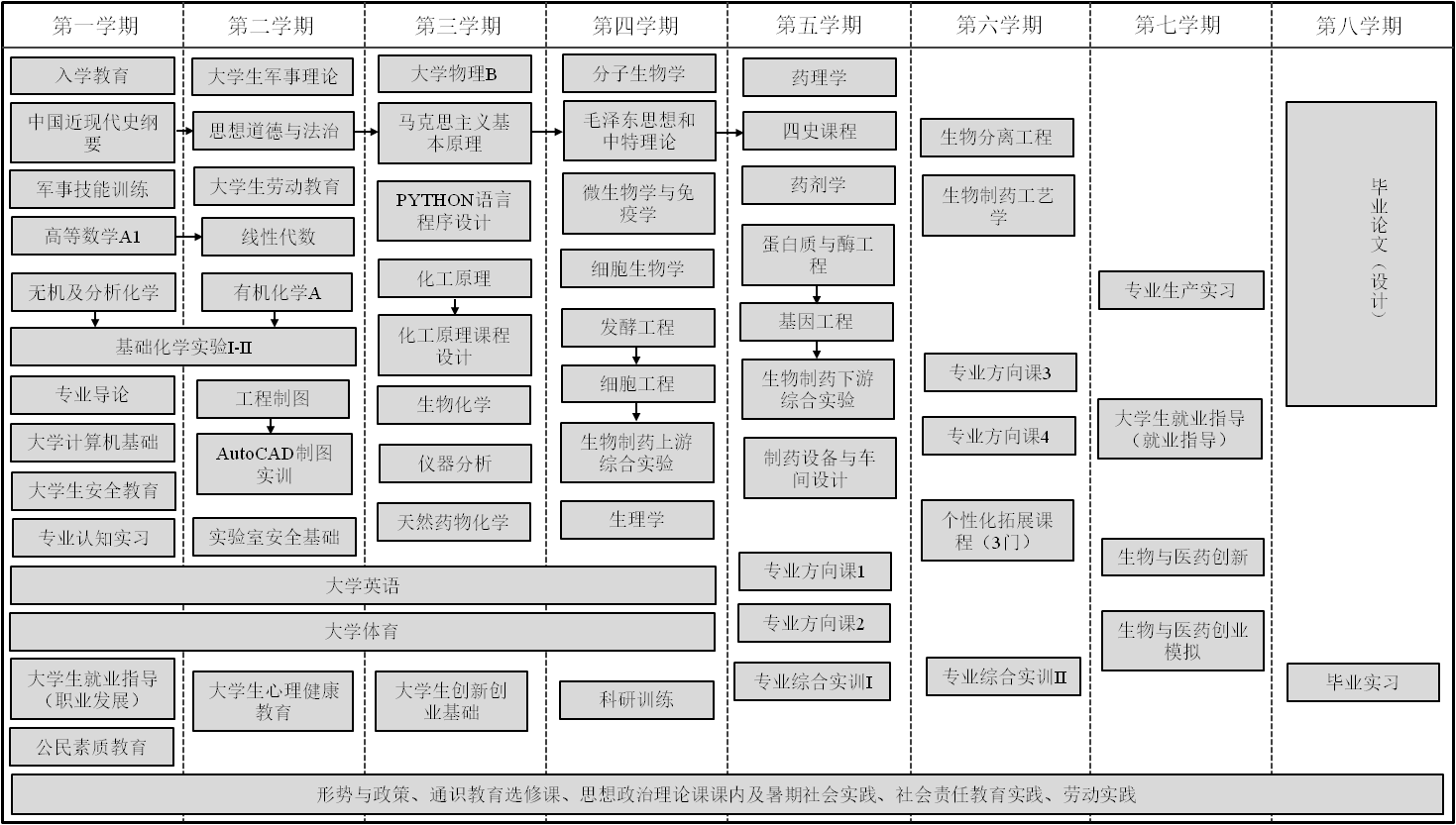专业核心课:生物分离工程、生物制药工艺学、发酵工程、蛋白质与酶工程、制药设备与车间设计等