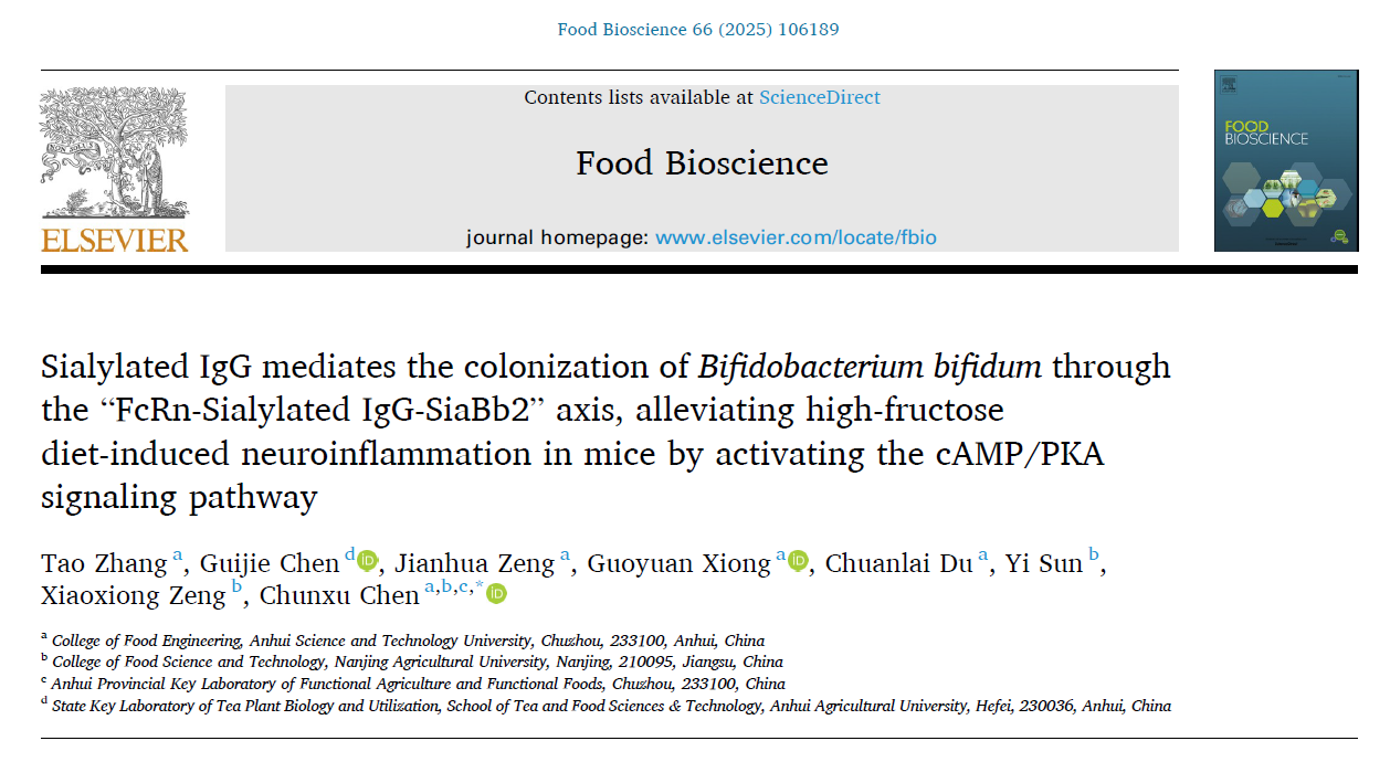 近日,食品科学与工程学院陈春旭副教授以通讯作者身份在国际Top期刊《Food Bioscience》(Q1,影响因子4.8)发表了题为“Sialylated IgG mediates the colonization ofBifidobacterium bifidum through the “FcRn-Sialylated IgG-SiaBb2” axis, alleviating high-fructose diet-induced neuroinflammation in mice by activating the cAMP/PKA signaling pathway”的研究论文,论文的第一作者为云鼎官方在线入口2023级食品加工与安全专业硕士研究生张涛,云鼎官方在线入口为第一完成单位,南京农业大学曾晓雄教授课题组为合作单位。