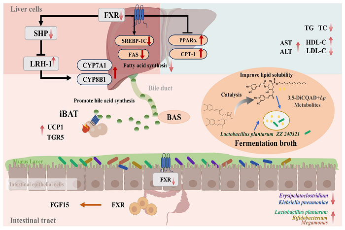 滁州,作为中国四大食用菊花产地之一,其特产滁菊(Chuzhou chrysanthemum)因独特的生长环境孕育了丰富的酚酸类活性物质,在功能食品领域备受推崇。该研究聚焦于滁菊的核心成分——3,5-二咖啡酰奎宁酸(3,5-DiCQA),揭示了其调节肠道菌群、抑制脂质合成方面的卓越潜力。然而,低亲脂性限制了其生物活性,限制了其应用价值。为破解这一瓶颈,陈春旭团队以滁菊中3,5-DiCQA为原料,成功合成并表征了其十二烷基酯衍生物(3,5-DiCQAD),显著提升了其亲脂性和生物活性。这一创新不仅增强了其在肠道中的吸收利用,还促进了有益菌L. plantarum的显著富集,进一步放大了其健康益处。研究进一步发现,3,5-DiCQAD在调节糖代谢和改善胰岛素抵抗方面展现出巨大潜力。团队成功分离出肠道中L. plantarum ZZ240321菌株,并证实其发酵3,5-DiCQAD后的代谢物可激活宿主FXR/SHP/LRH-1通路,调控胆汁酸代谢,有效缓解高脂饮食诱导的肥胖症状。