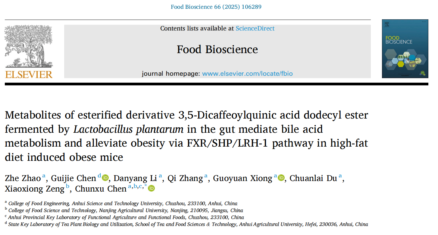 近日,食品科学与工程学院陈春旭副教授以通讯作者身份在国际Top期刊《Food Bioscience》(Q1,影响因子4.8)在线发表题为“Metabolites of esterified derivative 3,5-Dicaffeoylquinic acid dodecyl ester fermented by Lactobacillus plantarum in the gut mediate bile acid metabolism and alleviate obesity via FXR/SHP/LRH-1 pathway in  high-fat diet induced obese mice”的研究性论文。云鼎官方在线入口2022级食品加工与安全专业硕士研究生赵哲为论文的第一作者,云鼎官方在线入口为论文第一完成单位,南京农业大学曾晓雄教授课题组为合作单位。