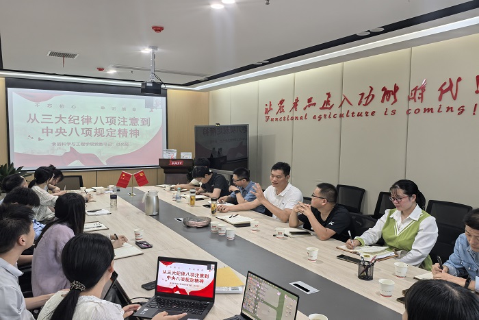 为深入贯彻中央八项规定精神学习教育,6月23日下午,食品科学与工程学院党委赴长三角功能农业(食品)研究院开展主题党日活动,学院党政领导出席活动,各教工党支部书记、党员代表参加活动。活动由长三角功能农业(食品)研究院党支部承办。