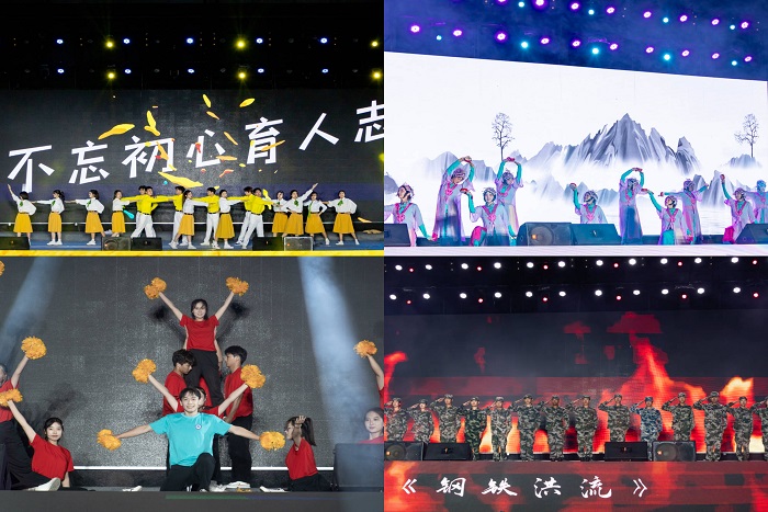 乐队演唱《我的未来不是梦》和《啦啦操》表演青春洋溢,彰显安科学子青春活力,将现场氛围推至高潮;教官们的《钢铁洪流》向大家展示了军人誓死捍卫国家主权和守卫祖国疆土决心与信心;《我们都是追梦人》传达的感情深邃而真挚,盛世如愿,安科青年生逢其时,追梦的脚步永不停止。