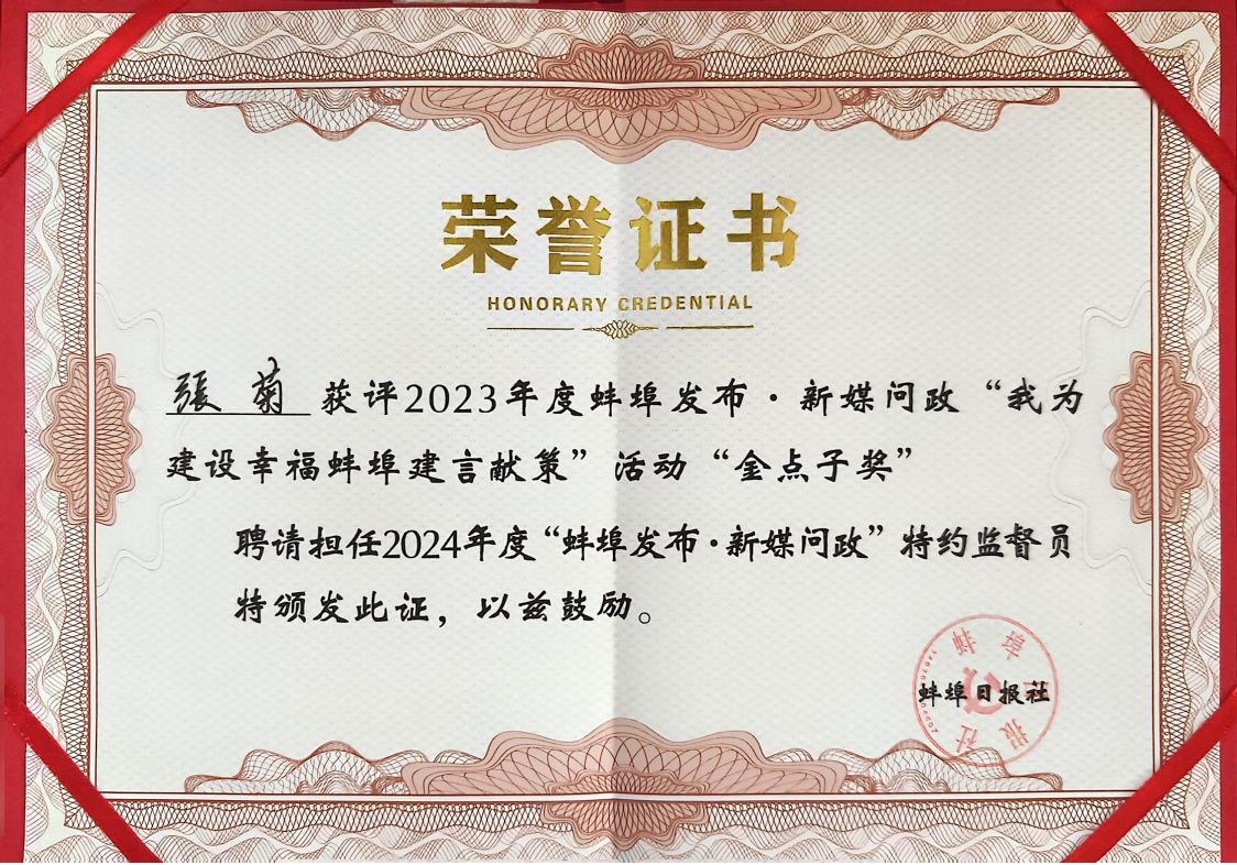 据悉,2023年,为走好网上群众路线,更好地激发市民和网民为城市高质量发展献计献策,蚌埠日报社发起“我为建设幸福蚌埠建言献策”征集活动,蚌埠市人大报送了张菊撰写的相关建议并获采纳。(摄影:张菊 审核:胡文靖 编辑:李锦)
