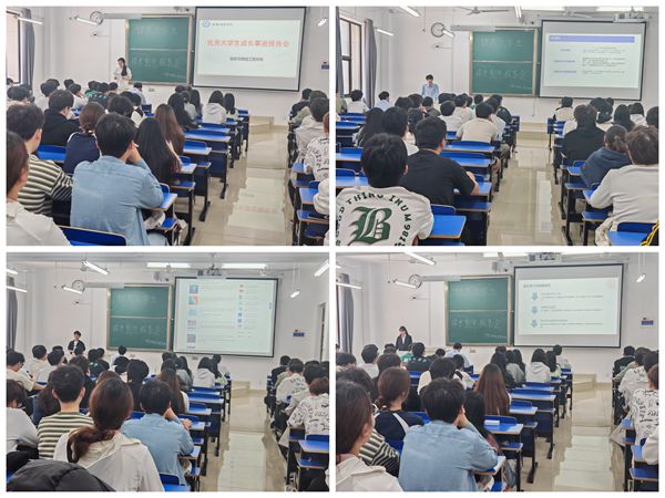 报告会上,四位优秀大学生阐述了各自的成长经历,并分享了提升自身能力的方法。刘盼盼同学从时间规划、学习目标、能力培养、强身健体等四个方面分享了自己的成长经历,勉励同学们志存高远、脚踏实地、奋力拼搏,让青春在奋斗中绽放绚丽之花。李夏杰同学分享了大学期间参加各种活动的经历,在勇于挑战自己敢于尝试新事物中不断进步成长,全面提升自身的综合素质。田晓宇围绕综合测评中“德、智、体、美、劳”几个方面分享自己心得,并在会上详细讲解如何参加学科竞赛以及参加比赛的渠道,希望同学们要珍惜大学时光,不负韶华,为自己的美好未来而努力奋斗。吕宏娜同学分享了自己大学生活的点滴,勉励学弟学妹们应树立正确的价值观,珍惜大学时光,努力求知问学,用奋斗抒写自己的无悔青春。