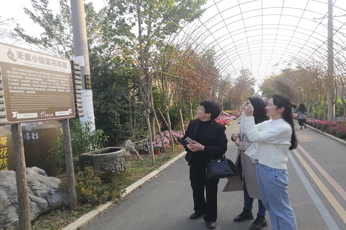 经花世界入口,进鹿儿岛,过星空小火车、欢乐岛、春来茶馆。在初冬季节里,夏菊、舌状菊、秋菊、墨菊、金背大菊等各式各样的菊花在暖阳微风里摇曳生姿,以白、黄、红、粉、绿等色彩为禾泉染上别样色彩,将禾泉的勃勃生机划分成一处处秩序井然的盎然状态。