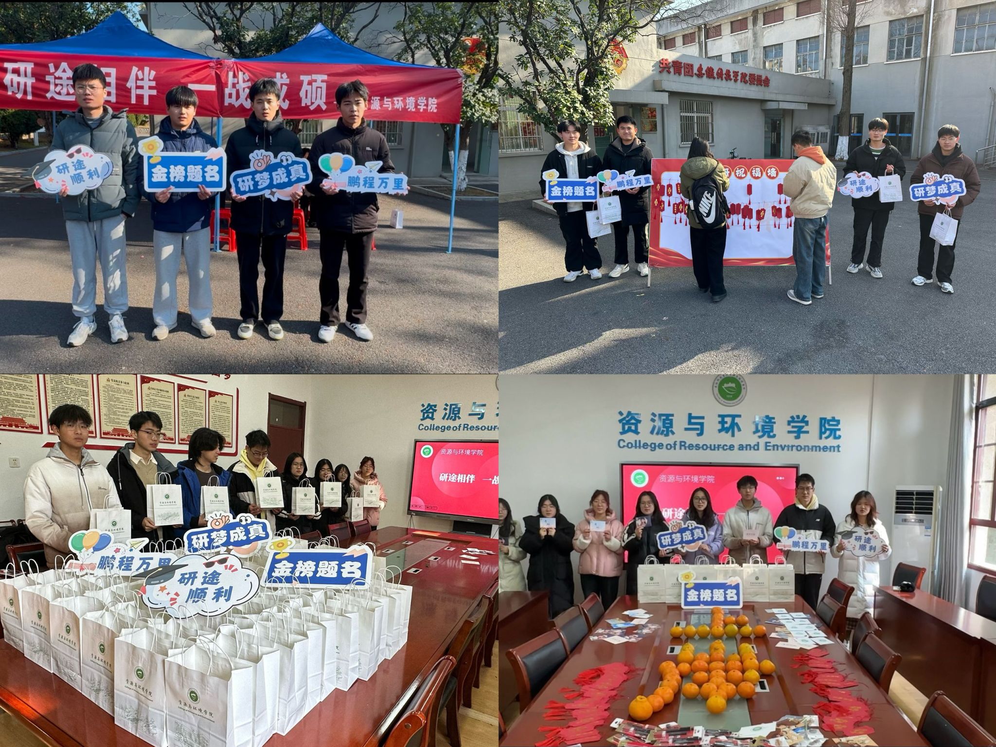 2025年全国硕士研究生招生考试即将来临,为助力考研学子坚定备考信心,缓解考研压力,12月18日中午,资源与环境学院在东办公楼举办了举办“研途相伴,一战成硕”考研送温暖活动,资源与环境学院专职辅导员王丽萍、王华雪参加本次活动。