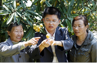 (我校校友杨俊森(中)为农户进行枇杷生产技术指导)