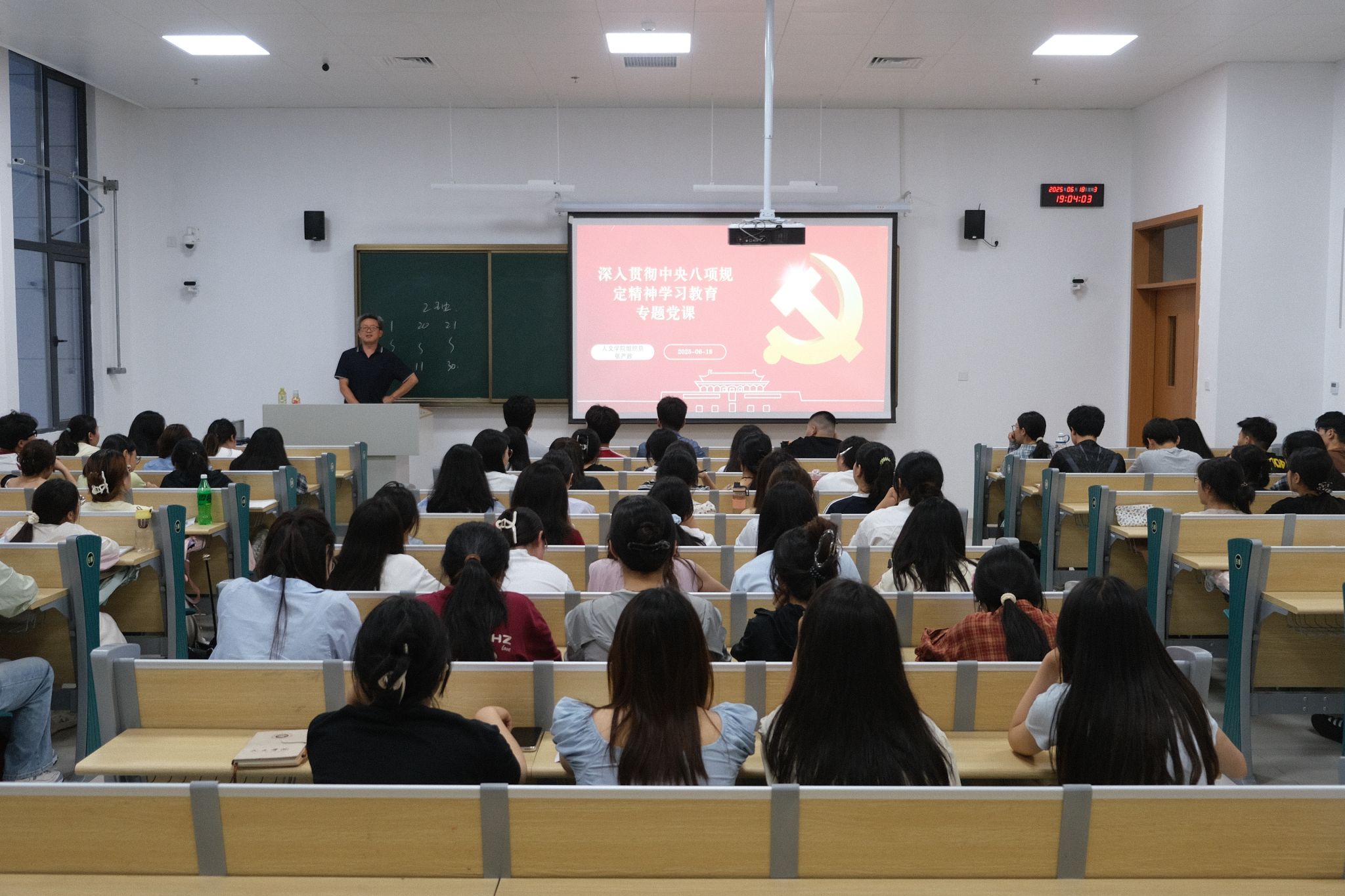为推深做实学习教育,扩大学习教育覆盖面,6月18日晚,人文学院在学思楼1号楼102教室举办深入贯彻中央八项规定精神学习教育专题党课,学院正处级组织员张严政主讲,学院全体学生党员和入党积极分子约150人参加专题党课学习。