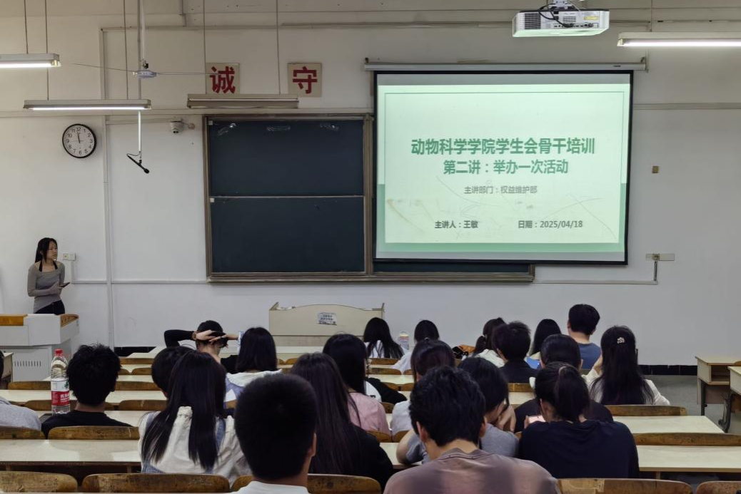 为提升学生干部的综合素质,4月18日中午,动物科学学院学生会在求知楼A105室举办骨干培训第二讲,培训由权益维护部负责人王敏主讲,学生会全体成员参加。