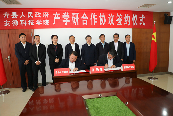 On October 29th, Anhui Science and Technology University and Shouxian County People's Government held the signing ceremony of an Industry-University-Research Cooperation Agreement. Li Shenghe, Vice President of Anhui Science and Technology University, and Hong Yiran, member of the Standing Committee of Shouxian County Committee and Minister of Organization, on behalf of both sides, signed the “Framework Agreement on Industry-University-Research Cooperation between Shouxian County People's Government and Anhui Science and Technology University”.