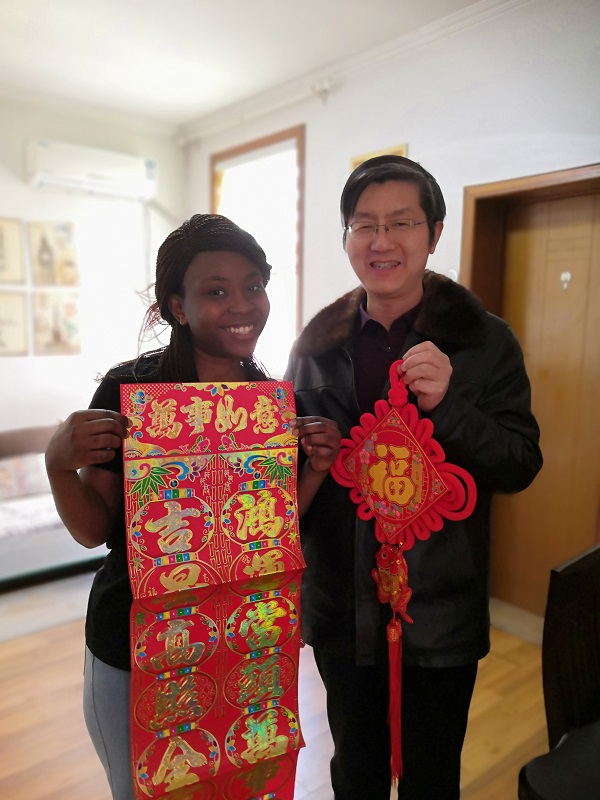 国际交流与合作处副处长王松华代表国际交流与合作处看望寒假留校的4名外籍教师及国际留学生,为他们送去诚挚的节日祝福及精心准备的春联、中国结、灯笼等节日礼物,并向外籍教师、国际留学生详细介绍了中国春节贴春联、挂灯笼等传统习俗的渊源及寓意。