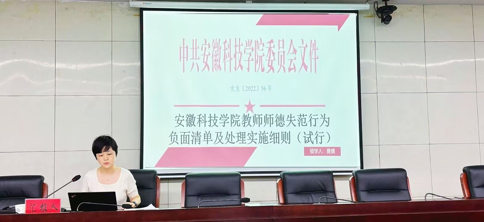 为进一步弘扬新时代高校教师道德风尚,强化教师履职履责,推进学校师德师风建设。2024年6月21日下午,在凤阳校区会议中心一楼报告厅党委教师工作部开展了师德师风教育宣讲会。各教学单位分管师德师风工作负责人、相关工作人员及教师代表参加了会议。会议由党委教师工作部副部长、人事处副处长、人力资源服务中心主任唐婧主持。 会上,唐婧详细讲解了十七条高校教师职业行为负面清单并结合具体案例介绍师德失...