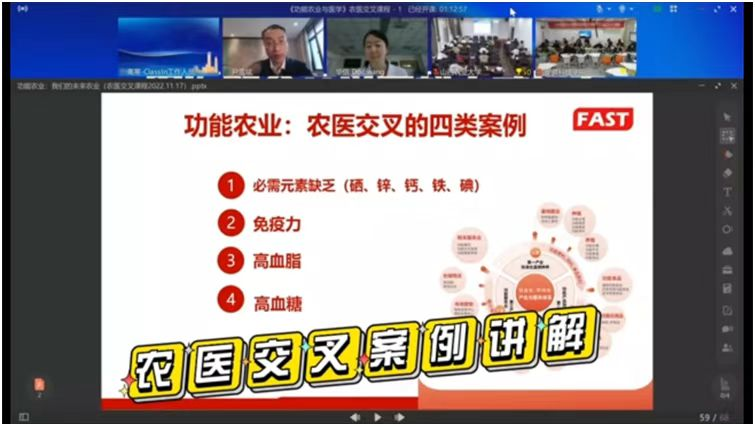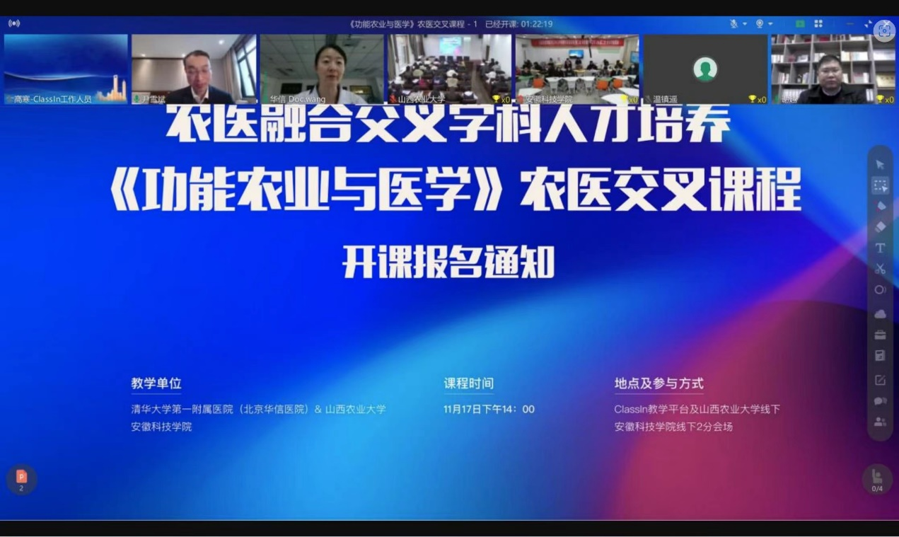 近日,我校与清华大学第一附属医院、山西农业大学合作举办了农医融合交叉学科人才培养课程首次授课。该课程由清华大学第一附属医院心血管内科副主任医师王晶、云鼎官方在线入口长三角功能农业(食品)研究院院长尹雪斌教授联合讲授。这也是《功能农业与医学》农医融合交叉第一课。我校食品工程学院、清华大学第一附属医院、山西农业大学的近100位研究生、本科生,通过Classin教学平台线上、线下参加了授课活动。