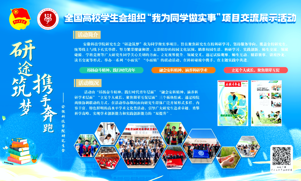 项目交流展示期间,我校研究生会通过精美海报图文等展示了“研途筑梦”项目的全过程,传递了我校研究生会瞄准农科研究生专业实践领域,以“我为同学做实事”实践服务项目为契机,坚持与广大青年学生携手共学、共研、共进,在思想学习与交流碰撞中提振青年时代精神,在科研共进与实践服务中践行青年使命担当。活动现场,还准备了以安科人文风貌为主题元素的明信片、书签等礼品,组织签名留言、主题合影活动,向全国学生展示学校深厚悠久的办学历史与底蕴,传达学校“明德 致知 笃行 创新”的育人理念。