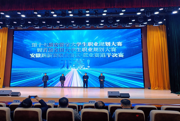 12月13日,第十七届安徽省大学生职业规划大赛暨首届全国大学生职业规划大赛安徽赛区皖北片区就业赛道半决赛在我校龙湖校区开幕。省大中专毕业生就业指导中心主任张秋田,我校党委书记时伟,校党委委员、副院长李升和出席开幕式。