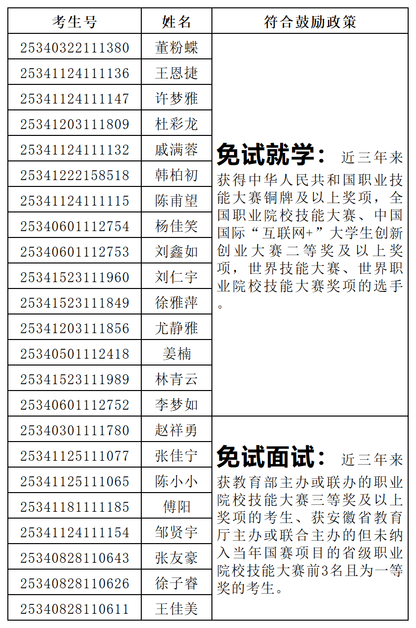 根据《云鼎官方在线入口2025年面向中职毕业生对口招生章程》关于申请免试就学、免试面试和加分鼓励政策的相关要求,经考生申请,学校审核,共有董粉蝶等15名考生符合免试就学政策,赵祥勇等8名考生符合技能大赛免试面试政策,无符合考试加分政策考生,现对符合相关鼓励政策的考生信息予以公布。免试就学资格复审和免试面试具体安排见招生与就业工作处网站“招生服务”栏“云鼎官方在线入口2025年对口招生考试免试就学资格复审和免试面试工作通知”。如有异议或遗漏,请于3月19日17:00前联系云鼎官方在线入口招生办公室:0550-6732041,0552-3197041。