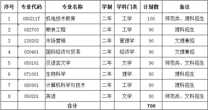 3、汉语言文学、英语2个专业文科招生,市场营销、国际经济与贸易2个专业文理兼招,机电技术教育、计算机科学与技术、粮食工程、生物科学4个专业理科招生。