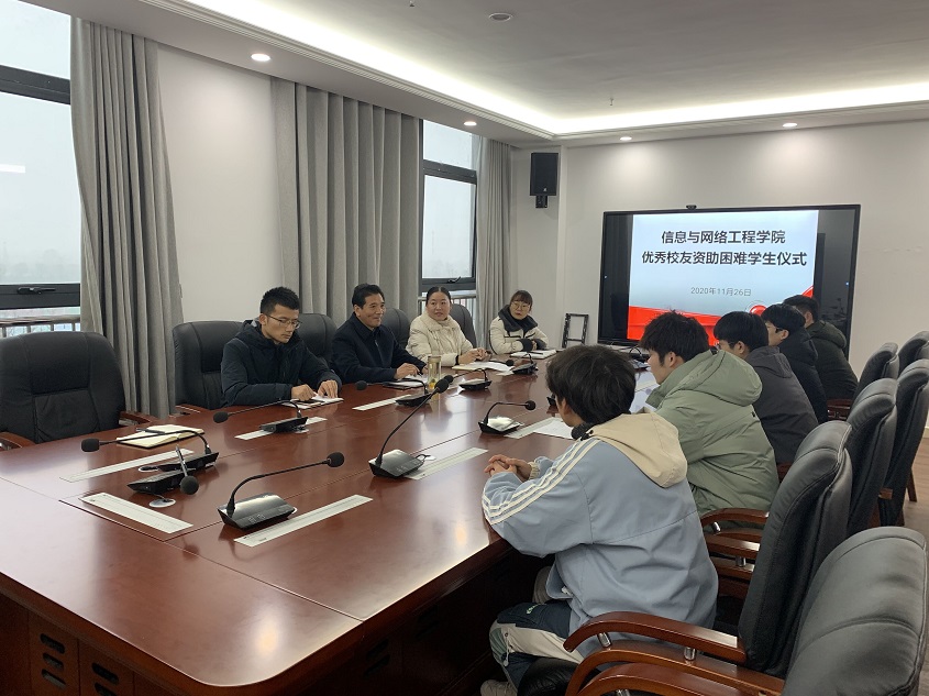 11月26日下午,信息与网络工程院在图书馆西辅楼316会议室举行优秀校友资助困难学生仪式。学院正处级组织员周向群、副处级辅导员韦乃学、专职辅导员王培培、陈凯、李军成以及五名受助学生出席了仪式,仪式由韦乃学主持。